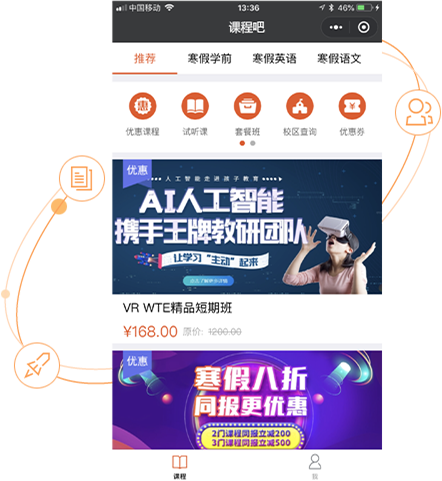 课程吧是一座连接培训机构与学员的桥梁,一方面帮助培训机构更简单、高效的创建课程、管理课程和传播课程,另一方面帮助学员更轻松、便捷的找到适合的课程报名。课程吧通过微信小程序为用户提供服务。课程的传播特色是通过优惠课程、拼团、砍价、答题赢课、拆红包、课程优惠券、分销员、试听课、课程套餐等多种火爆营销工具让学员积极参与并得到实惠。