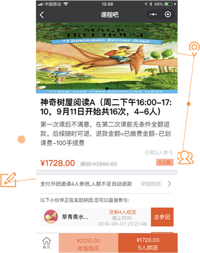 学员可以开团并分享好友或微信群一起拼团享受优惠