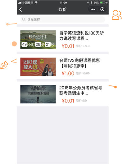 学员可以参与砍价并分享好友或微信群一起砍到折扣价或底价
